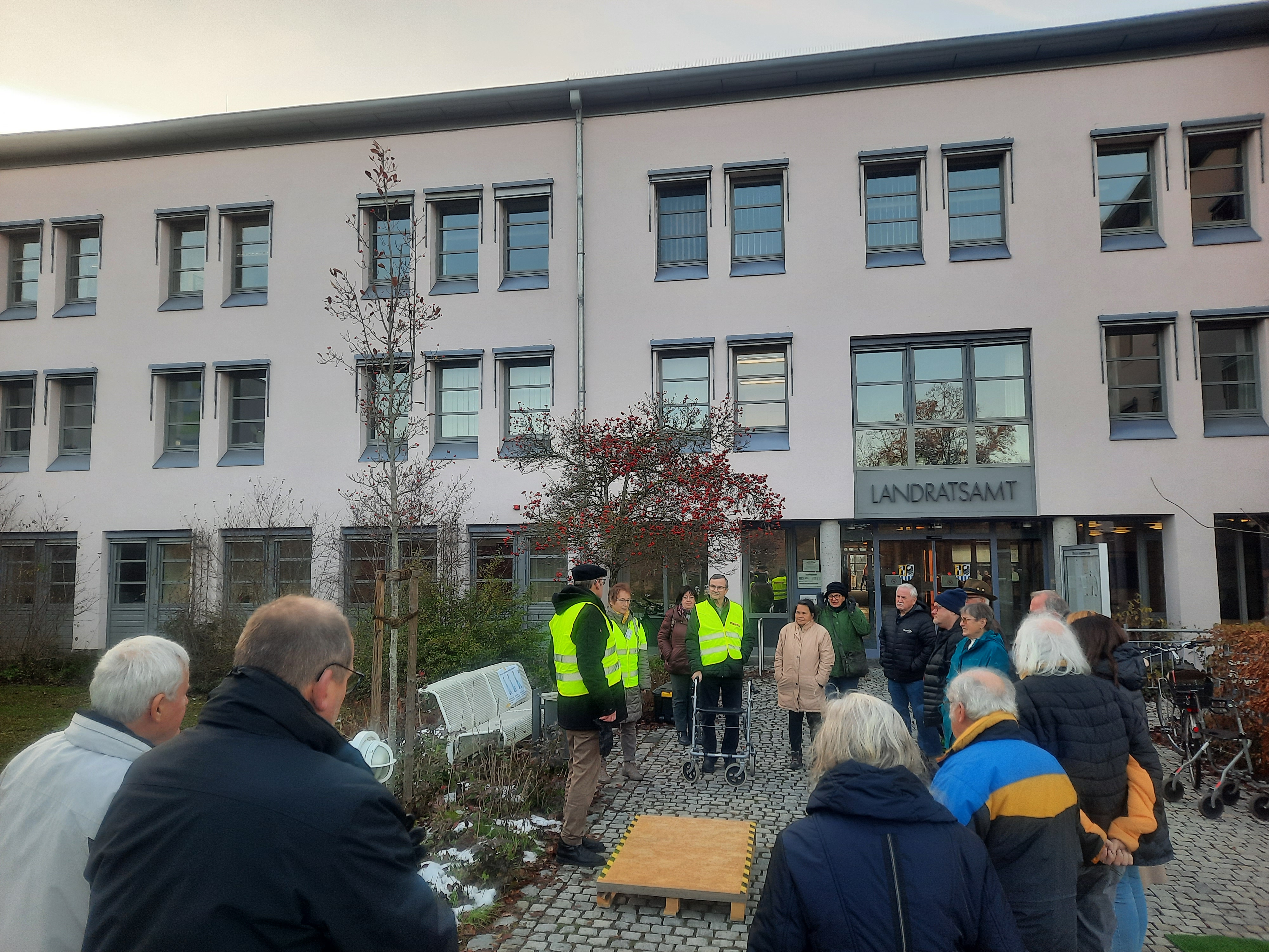 Zum zweiten Vortrag hatten Karl-Heinz Haag und sein Team von der Rollatorfahrschule der Kreisverkehrswacht einen kleinen Parcours vor dem Landratsamt aufgebaut. Mithilfe des Parcours wurden verschiedene Situationen simuliert und Inhalte (Drehen um die eigene Achse, Begehen verschiedener Untergründe und Gefälle, Überwinden von Hindernissen) praktisch vorgeführt. Besonders hingewiesen wurde auf die richtige Einstellung des Rollators und funktionirende Bremsen. Die Teilnehmer nutzten die Gelegenheit zum Üben und Ausprobieren. Der Besuch einer Rollatorfahrschule ist vor allem für Menschen, die außerhalb ihrer Wohnung den Rollator nutzen, sinnvoll. Zudem ist sie auch für Interessierte, die Angehörige oder Bekannte mit einem Rollator betreuen, durchaus aufschlussreich. Die nächste Rollatorfahrschule findet am Dienstag, 23. Januar 2024 von 13:00 bis 16:00 Uhr im Bürgersaal in Scheinfeld statt.