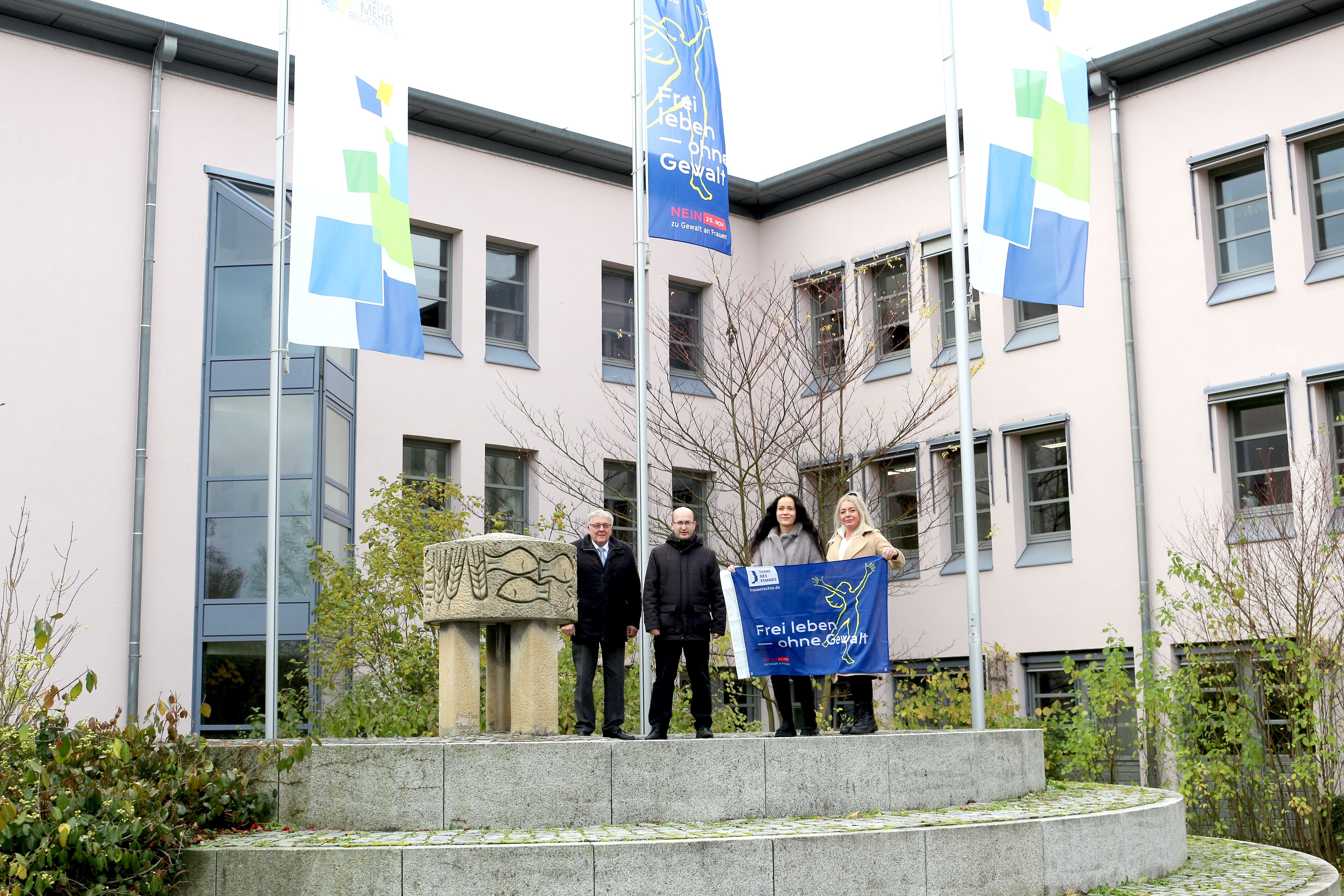Der Verein „Terre des Femmes“ veranstaltet im Rahmen des Internationalen Tags gegen Gewalt an Frauen seit 2001 eine Fahnenaktion unter dem Motto „Frei leben – ohne Gewalt“. Deshalb hissten die Gleichstellungsbeauftragten, bzw. die Mitarbeiterinnen des Frauennotrufs, Iris Regner und Sanja Knezevic, im Rahmen dieser Aktion gemeinsam mit Landrat Helmut Weiß und Abteilungsleiter für Kommunale und Soziale Angelegenheiten Tanju Cetinkaya die Flagge, die noch bis 1. Dezember 2023 am Landratsamt hängen bleiben wird. Im Jahr 2023 findet die Aktion unter dem Slogan „#StellDichNichtSoAn – steh auf gegen sexualisierte Gewalt an Frauen!“ statt. Mehr als 8.500 Fahnen in vielen verschiedenen Sprachen tragen die Botschaft über die ganze Welt.