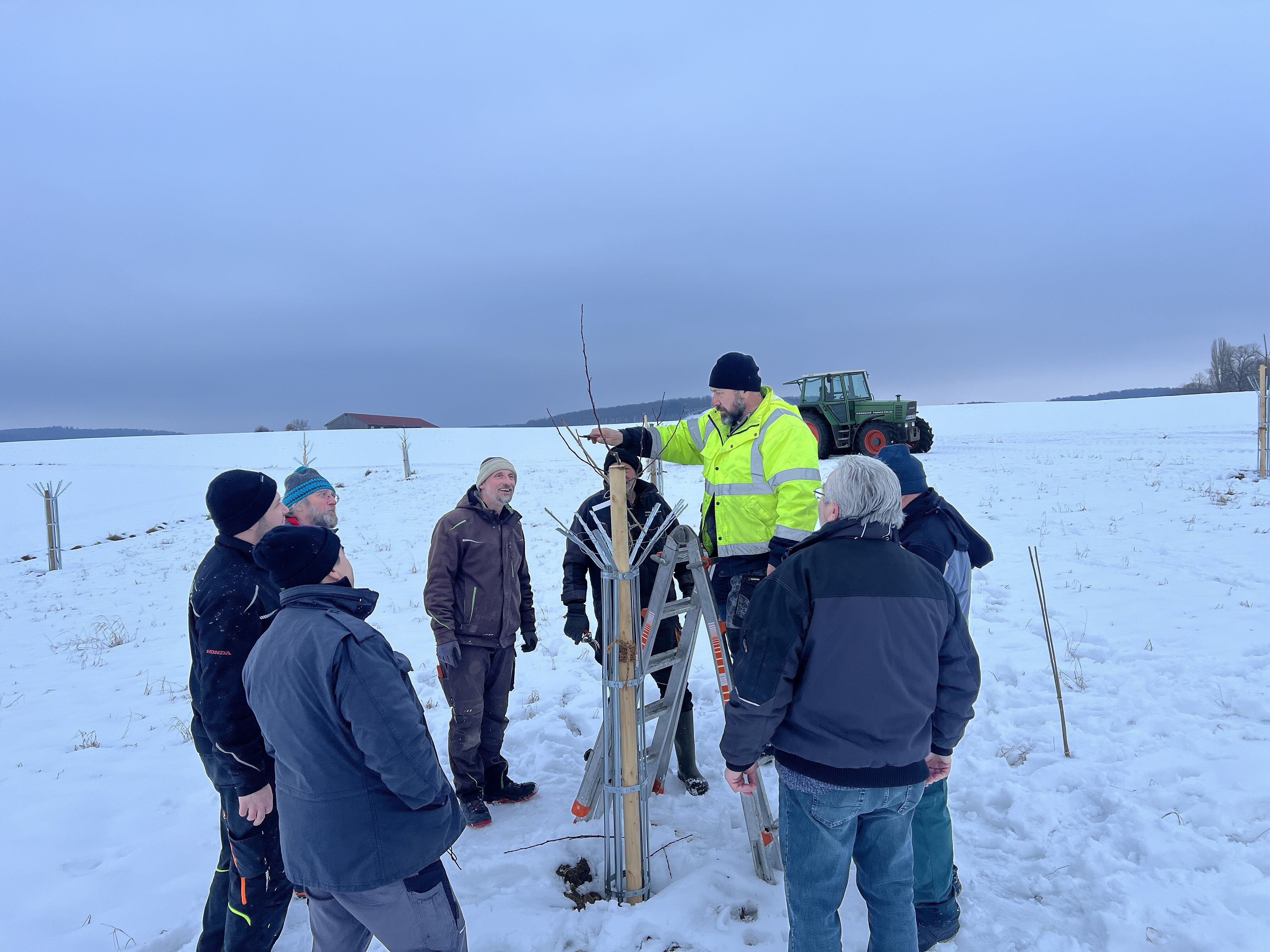 Nach dem Praxisteil begab sich die Gruppe gemeinsam zur neu angelegten Streuobstwiese in Reusch, die im Dezember gepflanzt worden war. Dort wurden die jungen Bäume entsprechend den zuvor vermittelten Grundsätzen geschnitten.