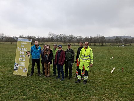 Bereit zum Start der Versuchspflanzung (von links): Florian Kleinschroth (Streuobstberater untere Naturschutzbehörde), Christian Weide (Baumwart), Anna Rühl (Landschaftspflegeverband), Clemens Nähr (Baumwart), Helga Kerwagen (Landschaftspflegeverband), Klaus Huprich (Baumwart), Jörg Petzold (Stadtgärtnerei Burgbernheim) und Manuel Seeg (Stadtgärtnerei Burgbernheim). Foto: Ernst Grefig