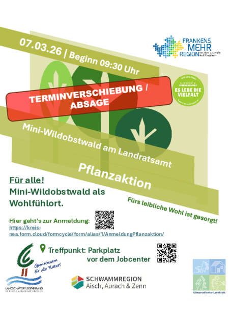 Aufgrund der aktuellen Witterungsbedingungen (Vernässung des Bodens), müssen wir den naturpädagogischen Pflanzaktionstag des geplanten Mini-Wäldchens am Jobcenter leider verschieben. Wir bitten die Umstände zu entschuldigen und werden den neuen Termin baldmöglichst bekanntgeben.
